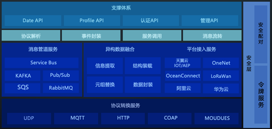 k豆钱包物联网中台是连接终端、平台与行业应用系统的数据交换中心。旨在解决不厂商、不同品类、不同通讯类型的终端端产品快速上云,同时实现对产品管理、产品协议解析、设备管理、存储、转发和命令下发等功能;应用侧提供了丰富API接口,多元数据推送功能。使平台接入者可以更加专注于自身应用的开发,而不用将工作重心放在设备接入层的环境搭建上。从而缩短物联网系统的形成周期,降低平台接入者研发、运营和运维成本。